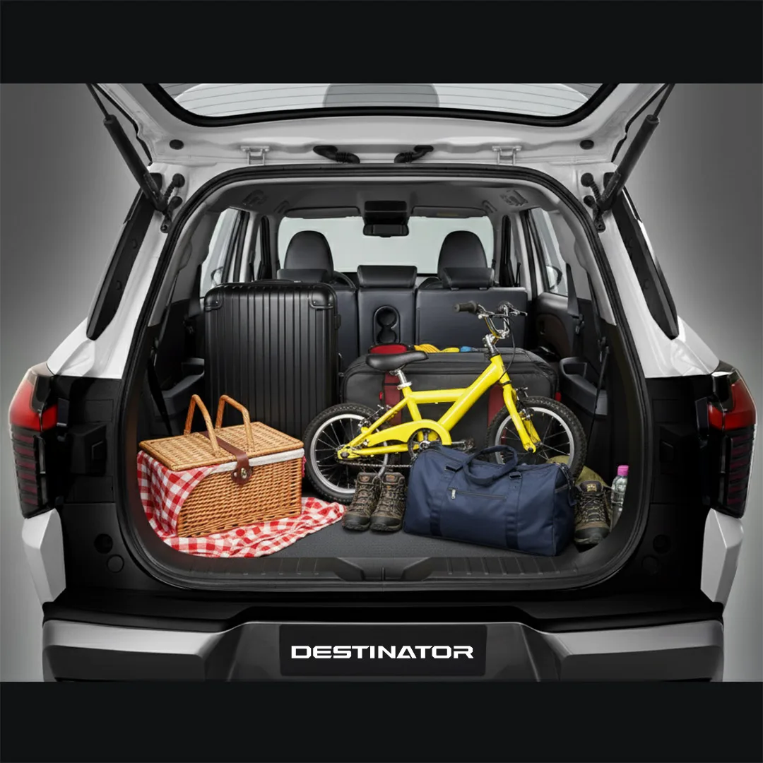 Thiết kế đuôi xe Destinator áp dụng triết lý Hexaguard Horizon cùng những đường nét dập nổi đầy đặn nhấn mạnh tính tiện dụng bên cạnh vẻ ngoài bề thế của xe. Cụm đèn hậu LED hình chữ T tạo cảm giác mở rộng về chiều ngang, trong khi các đường nét đặt dọc của cụm đèn củng cố thêm sự ổn định và vững chãi.